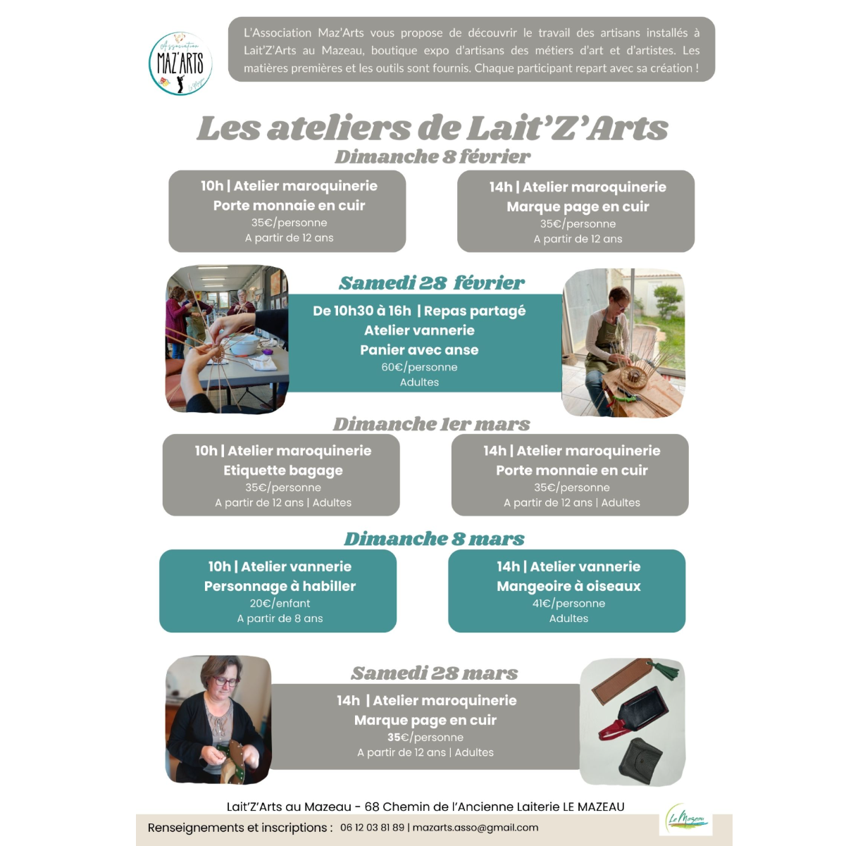 Vous pouvez contacter Maz'Arts au 06 12 03 81 89 ou par email à mazarts.asso@gmail.com pour plus de renseignements ou pour vous inscrire.