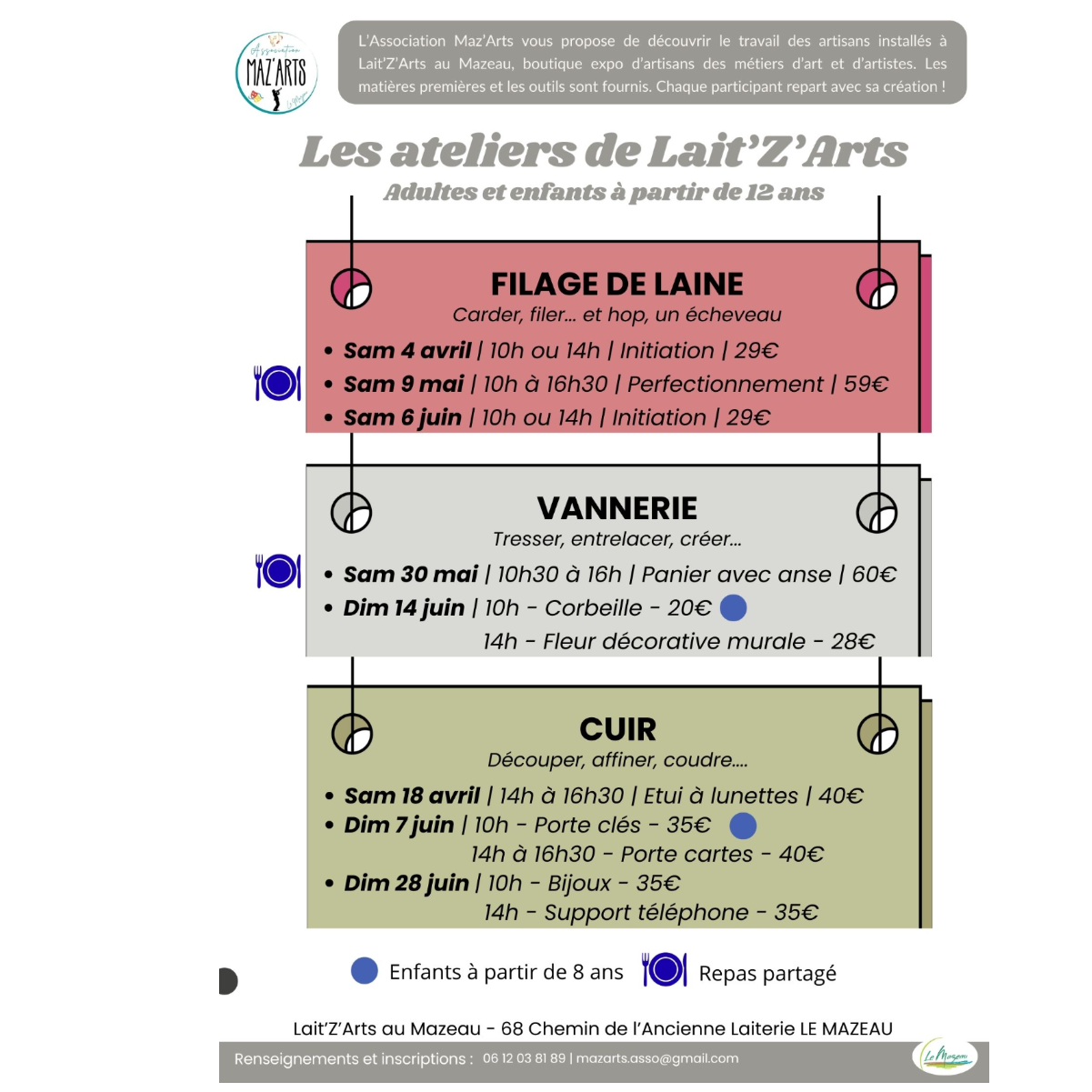 Vous pouvez contacter Maz'Arts au 06 12 03 81 89 ou par email à mazarts.asso@gmail.com pour plus de renseignements ou pour vous inscrire.